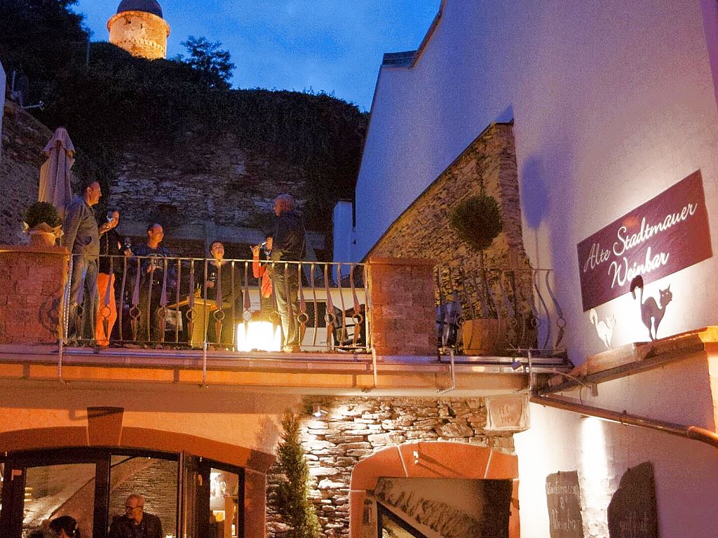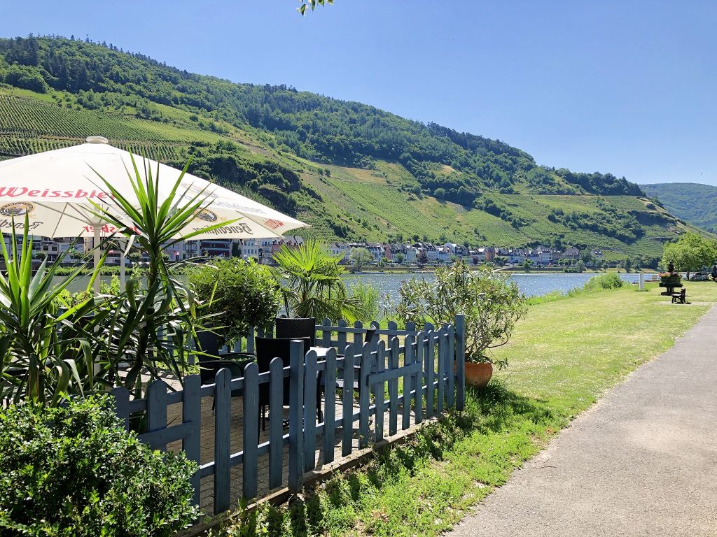 Am Abend ein Glas Mosel Rivaner auf der Terrasse am Moselufer genießen